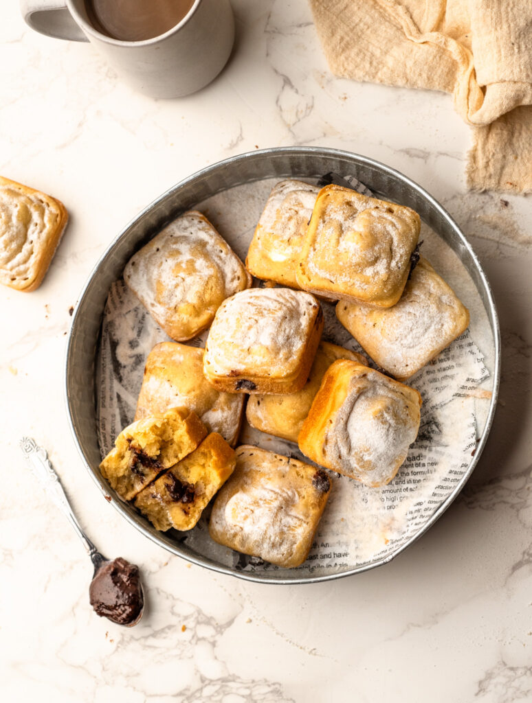 - Once cool, use a small knife or skewer to create a hole on the side of each beignet square. Insert the piping nozzle into the hole and gently fill the center with the chocolate mixture.