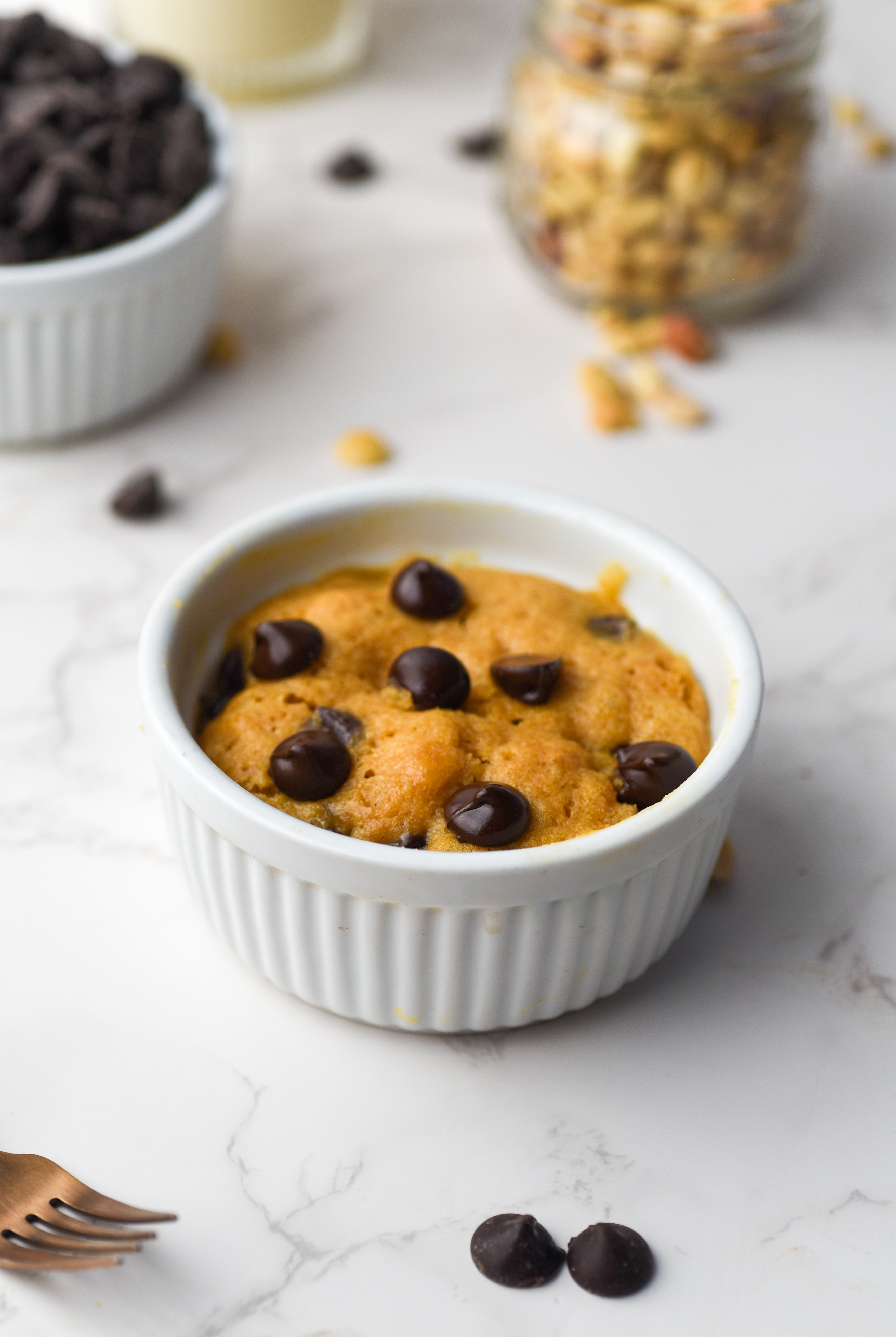 This is one of my personal favorites. It’s like a warm peanut butter hug in a ramekin. Fluffy, moist, and studded with chocolate chips that get perfectly melty as it bakes.