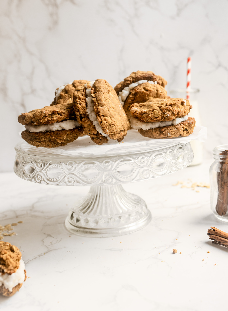 The oatmeal cookies are slightly chewy from the oats, and soft. They are sweetened with coconut sugar to give them a brown sugar flavor! The creamy frosting/filling is achieved with coconut butter based frosting. However, if you prefer a more classic buttercream filling, feel free to use a store bought, low sugar icing.