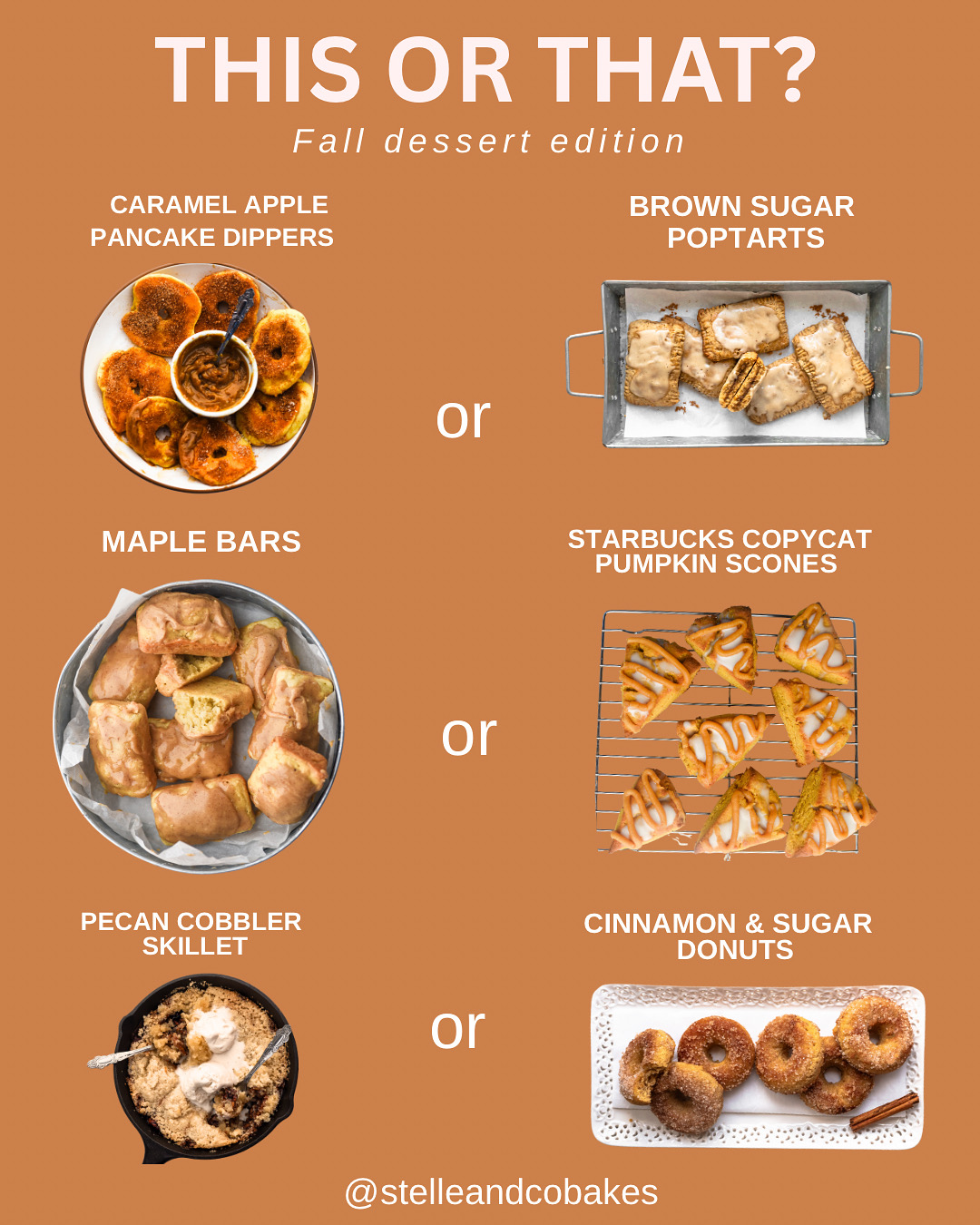 Nothing says cozy season like warm spices, sweet maple drizzle, crisp apples, and all things pumpkin. I pulled together some of my favorite fall dessert recipes so you can play along with the “This or That?” challenge from my Instagram — and bake your favorites at home.